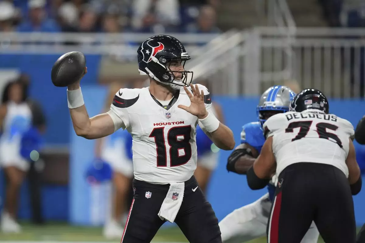 Houston Texans quarterback Graham Mertz (18) throws a pass against the Detroit Lions during the first half of an NFL football game Saturday, Aug. 23, 2025, in Detroit. (AP Photo/Paul Sancya)