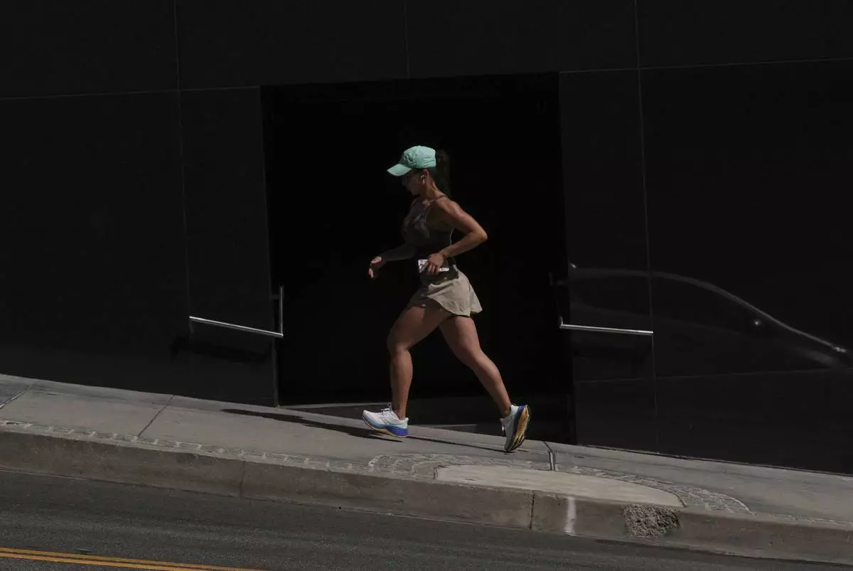 A jogger runs up an inclined sidewalk in the heat on Thursday, Aug. 21, 2025, in Los Angeles. (AP Photo/Damian Dovarganes)