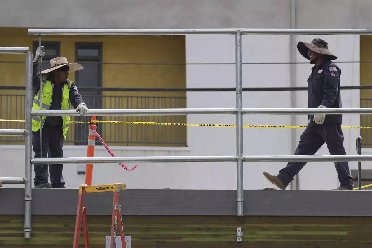 Construction crews work in the heat on Thursday, Aug. 21, 2025, in Los Angeles. (AP Photo/Damian Dovarganes)