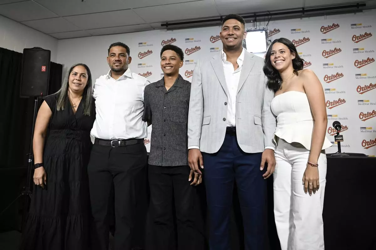 Baltimore Orioles' Samuel Basallo, second from right, poses for a photograph with his family and girlfriend after a press conference for his contract extension Saturday, Aug. 23, 2025, in Baltimore. (AP Photo/Terrance Williams)