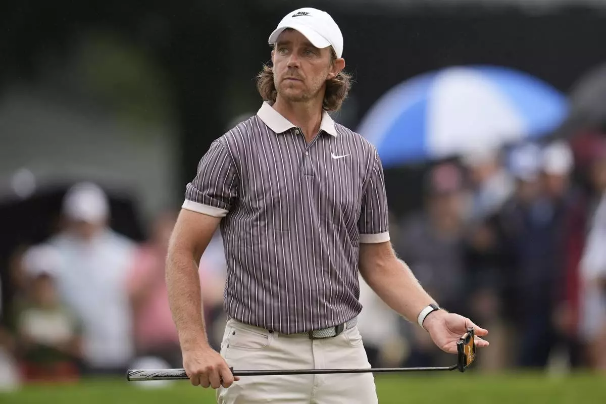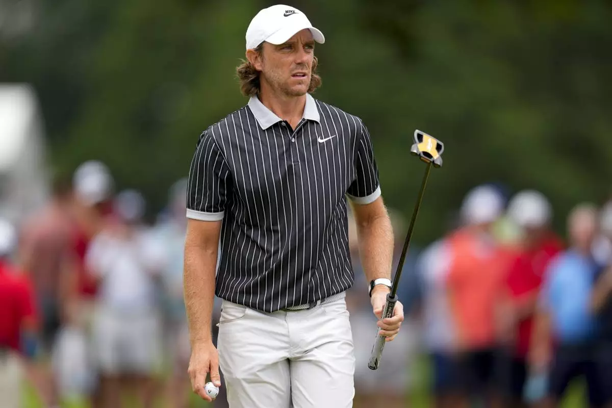 Tommy Fleetwood, of England, walks off the second green during the third round of the Tour Championship golf tournament, Saturday, Aug. 23, 2025, in Atlanta. (AP Photo/Mike Stewart)