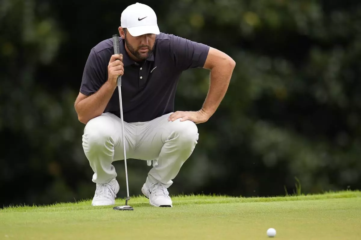 Scottie Scheffler lines up his putt on the second green during the third round of the Tour Championship golf tournament, Saturday, Aug. 23, 2025, in Atlanta. (AP Photo/Mike Stewart)