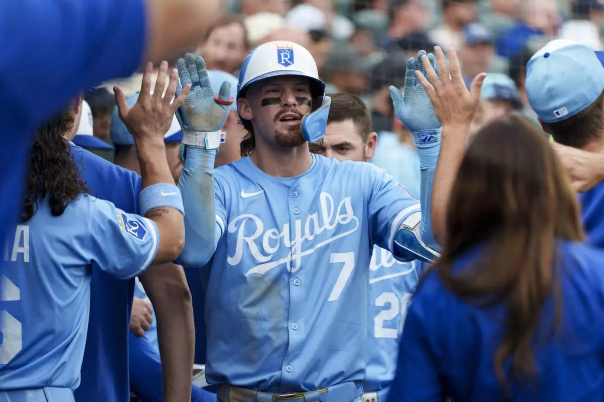 Kansas City Royals' Bobby Witt Jr. (7) celebrates a home run score during the sixth inning of a baseball game against the Detroit Tigers, Saturday, Aug. 23, 2025, in Detroit. (AP Photo/Josh Boland )