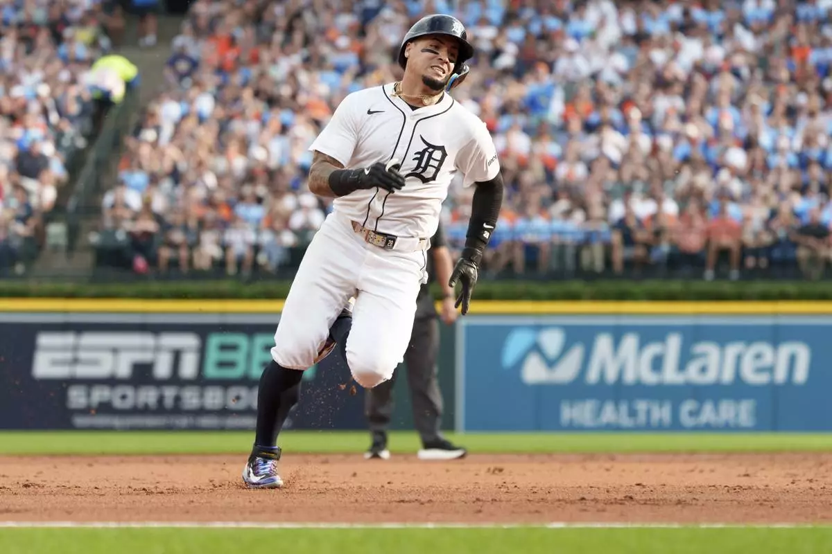 Detroit Tigers' Javier Báez runs to third base during the third inning of a baseball game Kansas City Royals Saturday, Aug. 23, 2025, in Detroit. (AP Photo/Josh Boland )