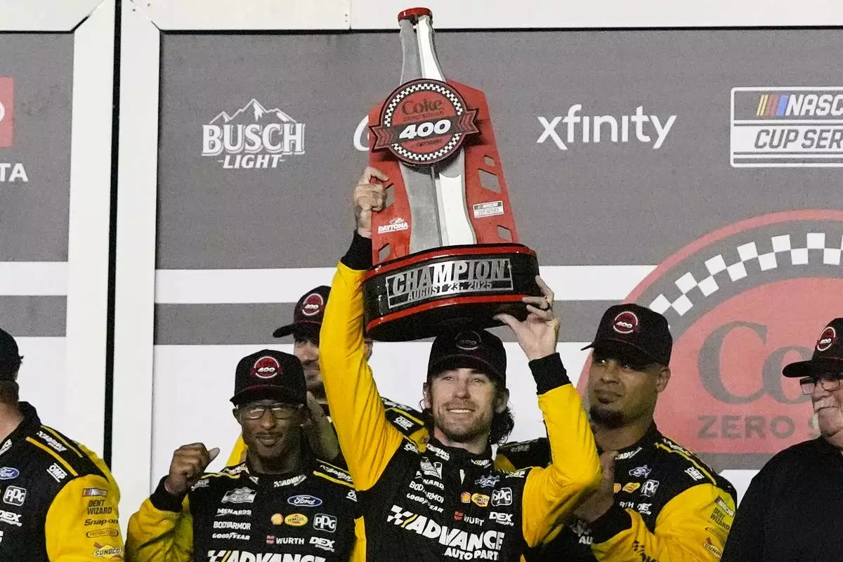 Ryan Blaney holds the championship trophy as he celebrates in Victory Lane after winning a NASCAR Cup Series auto race at Daytona International Speedway, Saturday, Aug. 23, 2025, in Daytona Beach, Fla. (AP Photo/John Raoux)