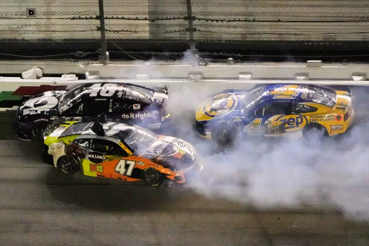 Alex Bowman (48), Ricky Stenhouse Jr. (47) and Noah Gragson (4) get caught up in a crash on the front stretch during a NASCAR Cup Series auto race at Daytona International Speedway, Saturday, Aug. 23, 2025, in Daytona Beach, Fla. (AP Photo/John Raoux)