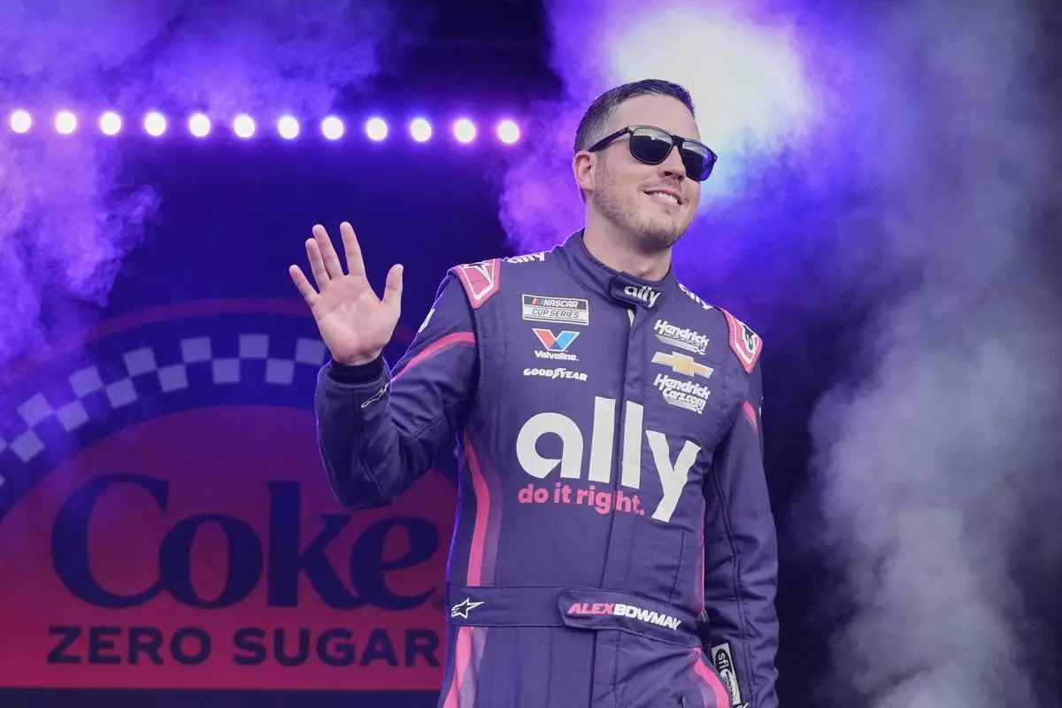 Alex Bowman waves to fans before the start of a NASCAR Cup Series auto race at Daytona International Speedway, Saturday, Aug. 23, 2025, in Daytona Beach, Fla. (AP Photo/John Raoux)