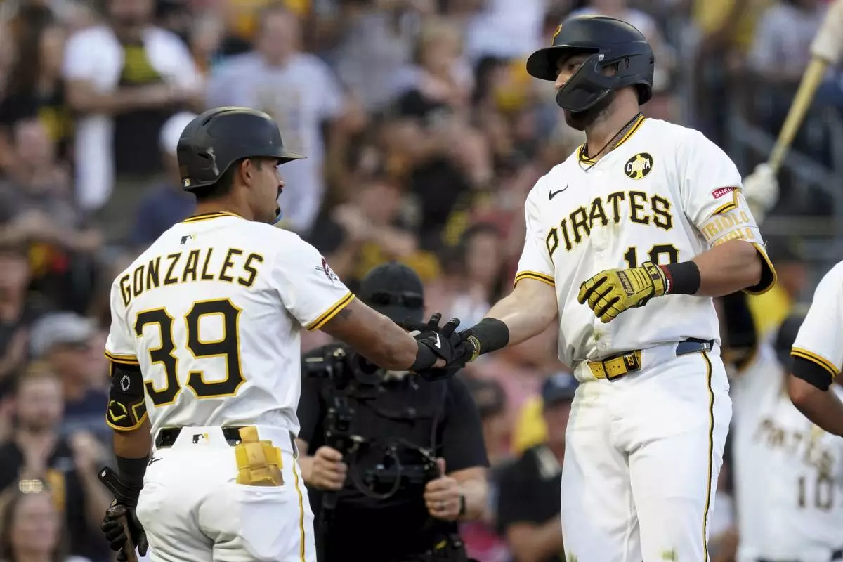 Pittsburgh Pirates' Jared Triolo, right, is greeted by Nick Gonzales, left, after hitting a two-run home run during the third inning of a baseball game against the Colorado Rockies, Saturday, Aug. 23, 2025, in Pittsburgh. (AP Photo/Matt Freed)