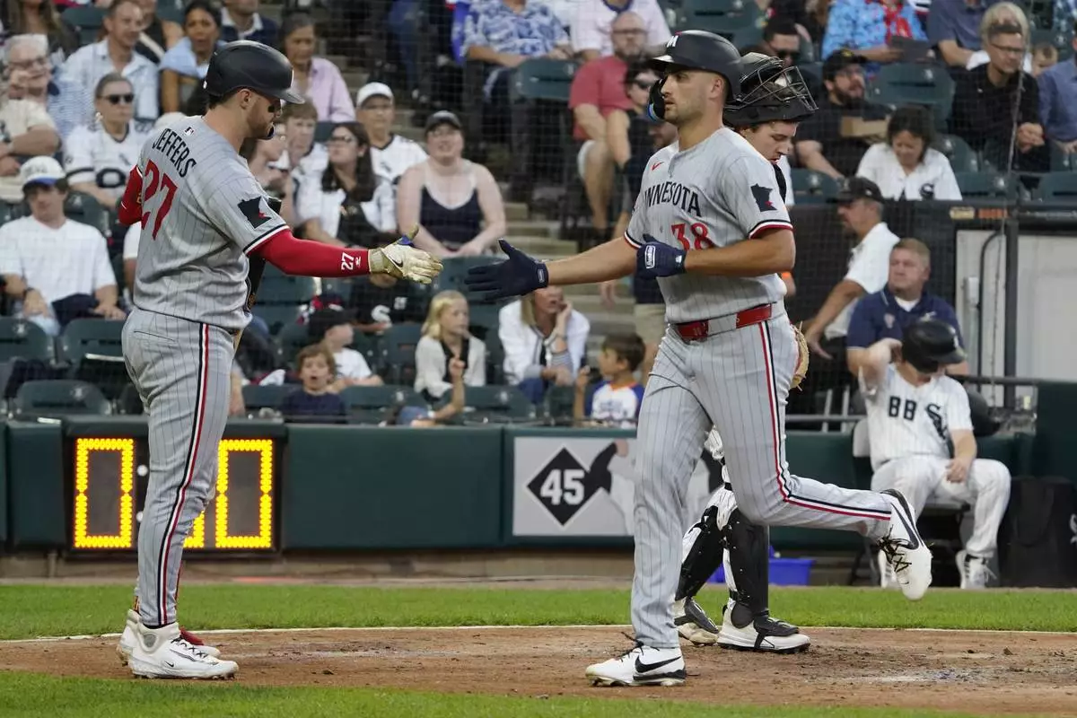 Minnesota Twins' Matt Wallner, right, is greeted by Ryan Jeffers, left, after hitting a home run against the Chicago White Sox during the fourth inning of a baseball game Saturday, August 23, 2025, in Chicago. (AP Photo/David Banks)