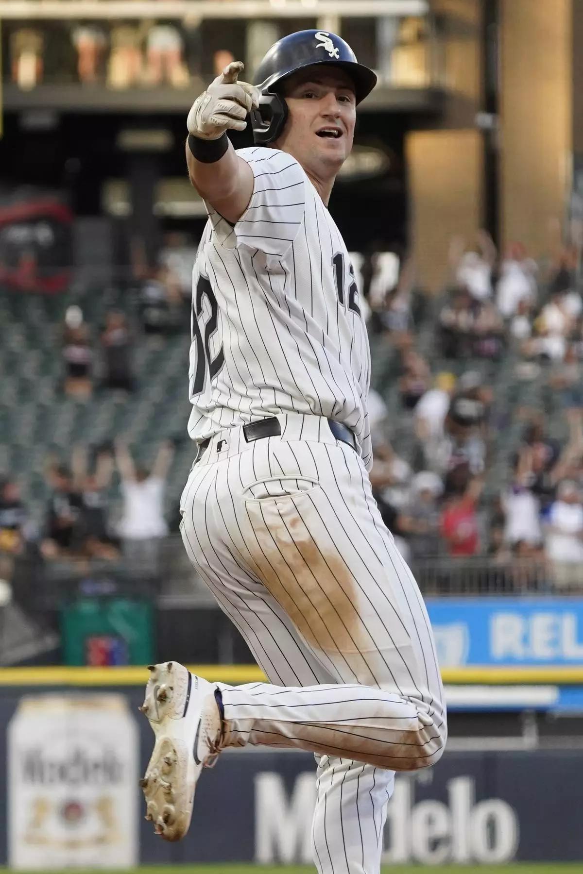 Chicago White Sox's Colson Montgomery gestures after hitting a grand slam against the Minnesota Twins during the second inning of a baseball game Saturday, August 23, 2025, in Chicago. (AP Photo/David Banks)