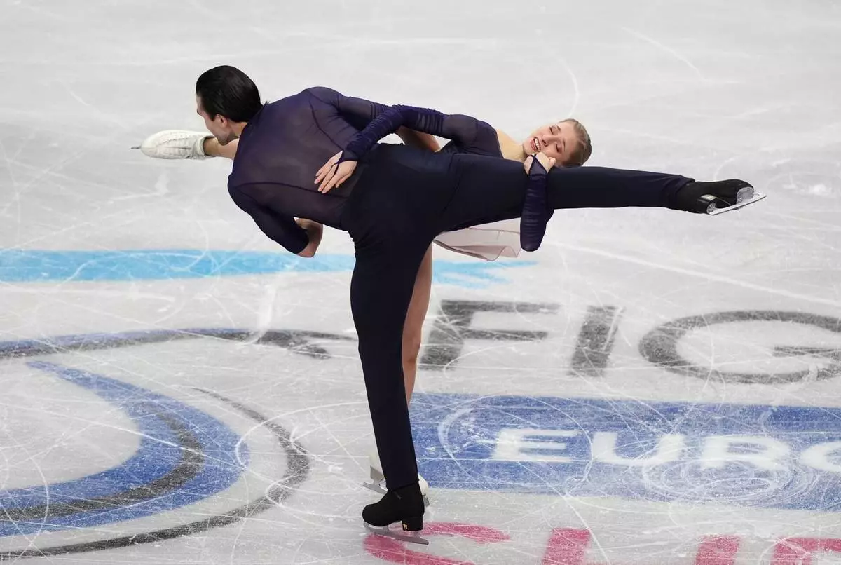 Germany's Minerva Fabienne Hase and Nikita Volodin compete during the Pairs Free Skating on day two of the ISU European Figure Skating Championships in Sheffield, England, Thursday, Jan. 15, 2026. (Mike Egerton/PA via AP)