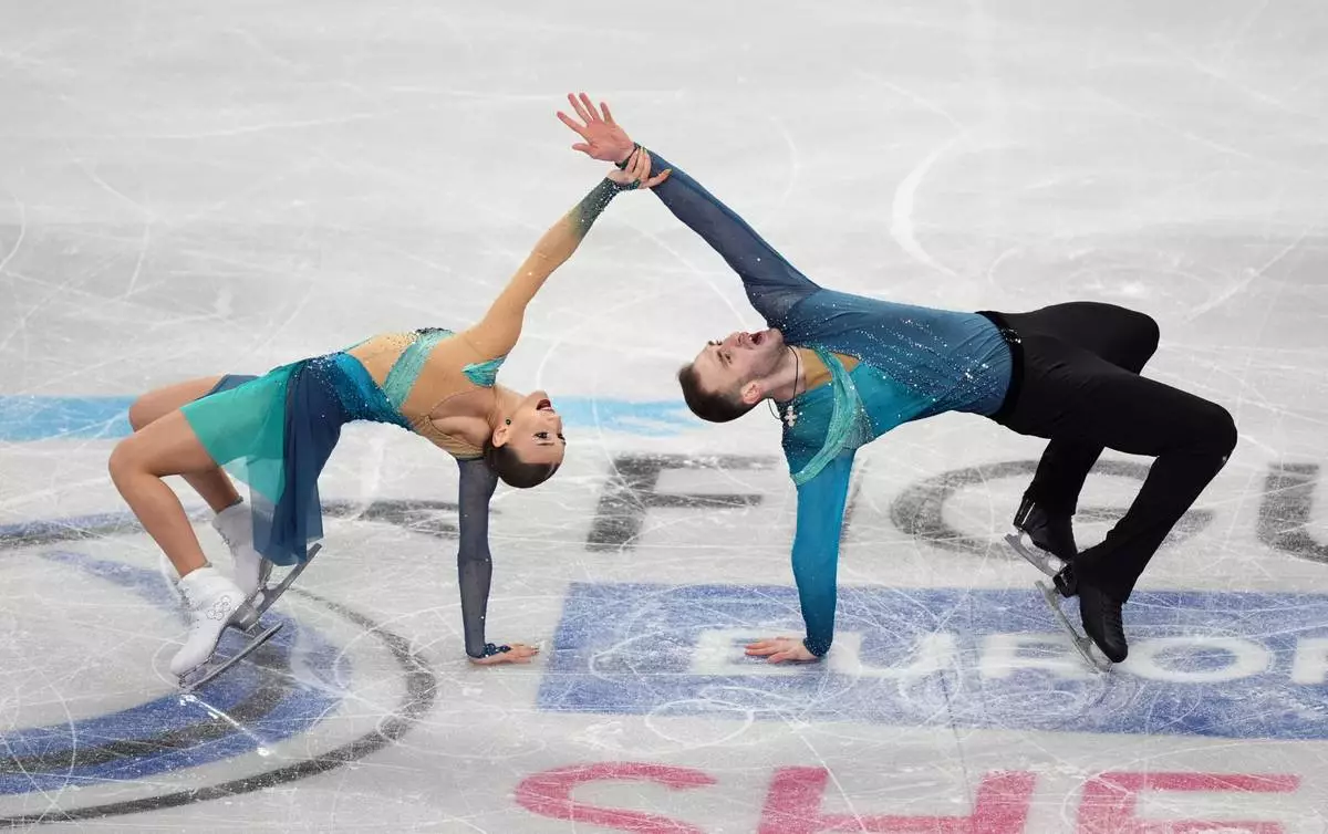 Georgia's Anastasiia Metelkina and Luka Berulava compete during the Pairs Free Skating on day two of the ISU European Figure Skating Championships in Sheffield, England, Thursday, Jan. 15, 2026. (Mike Egerton/PA via AP)