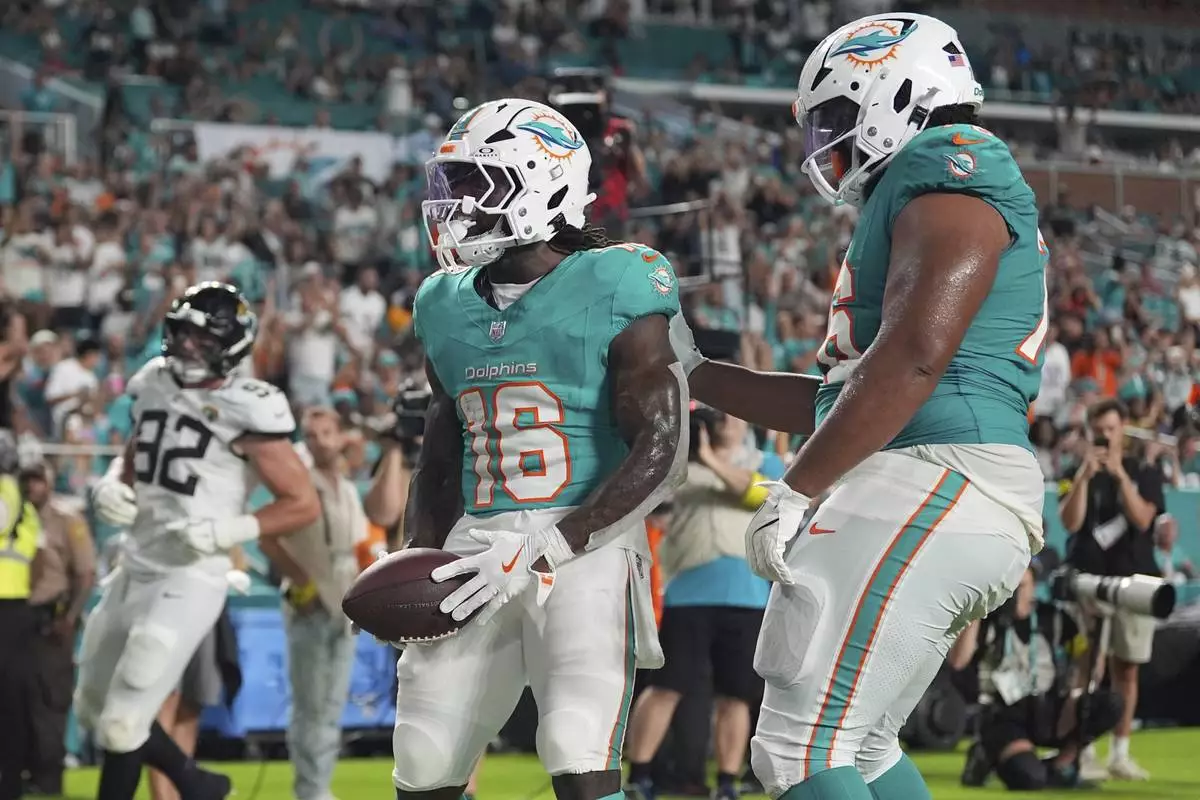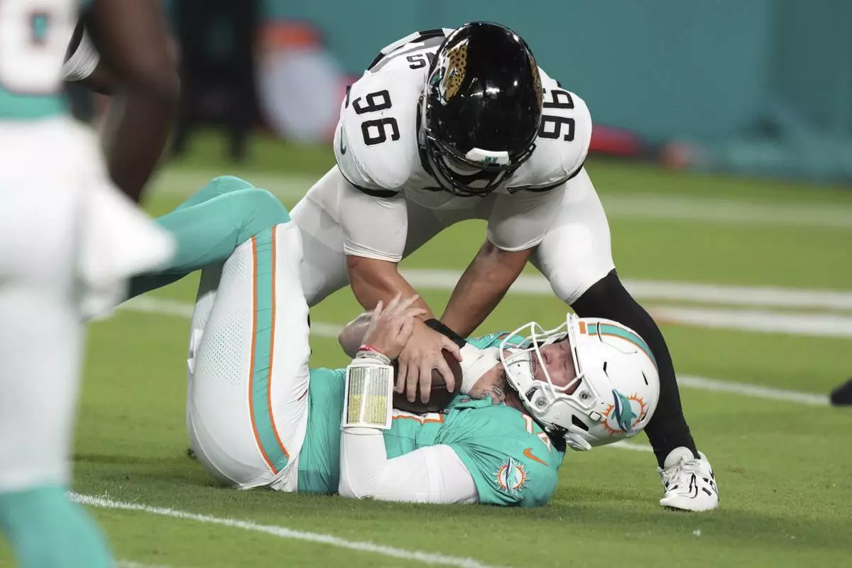 MIAMI GARDENS, Fla. (AP) — Tua Tagovailoa threw a 25-yard touchdown pass and was sacked twice in his only action of the preseason, and the Miami Dolphins beat the Jacksonville Jaguars 14-6 on Saturday night.