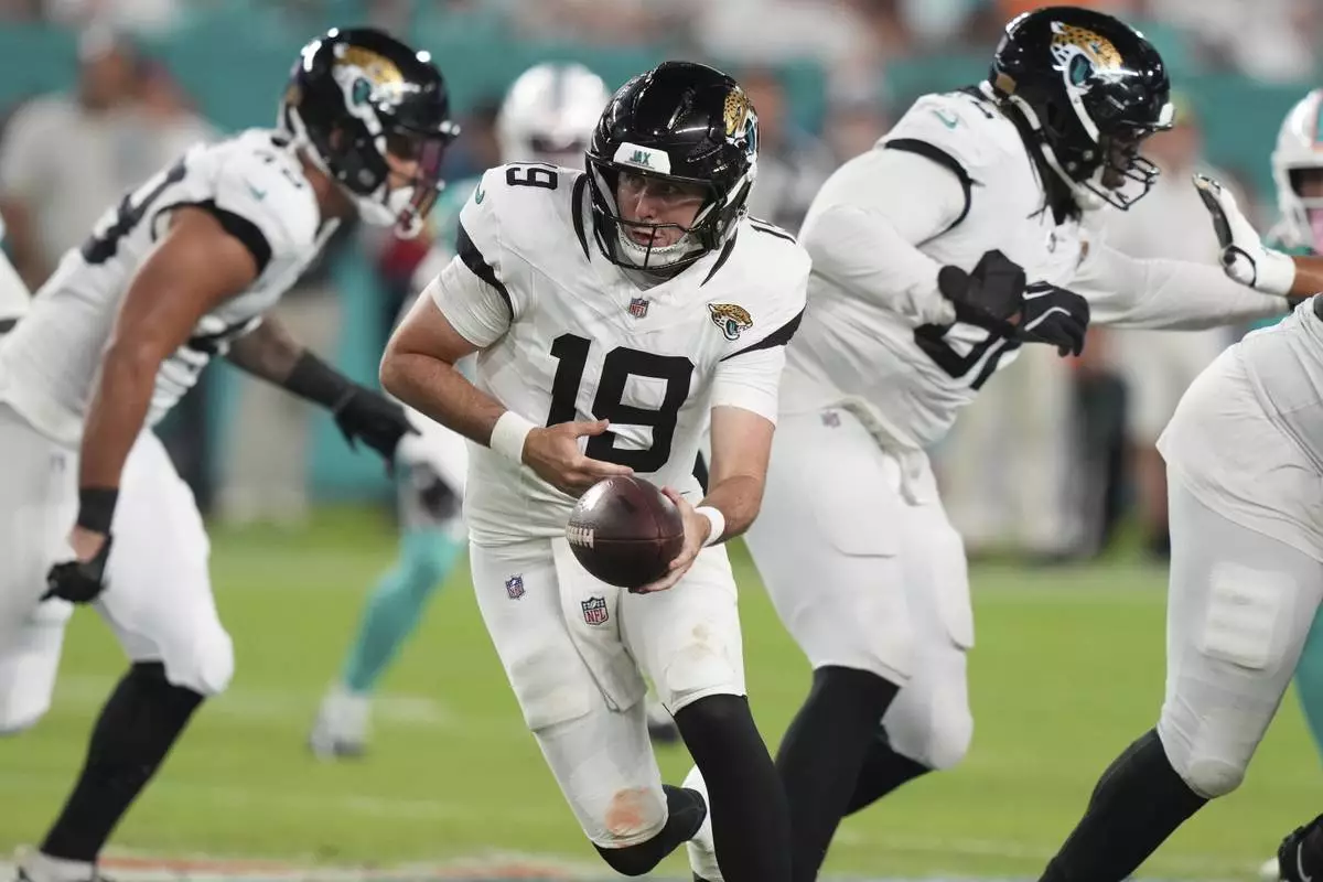 Jacksonville Jaguars quarterback Seth Henigan (19) looks to hand off the football during the second half of an NFL preseason football game against the Miami Dolphins, Saturday, Aug. 23, 2025, in Miami Gardens, Fla. (AP Photo/Lynne Sladky)