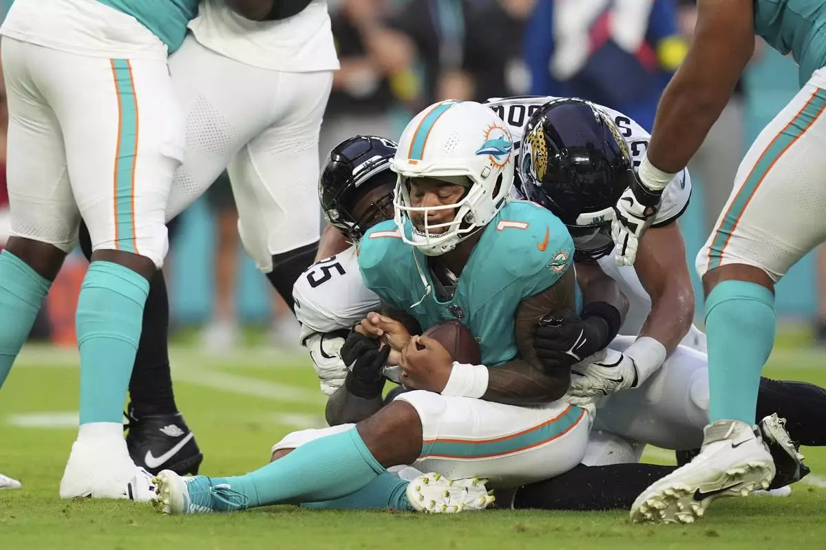 Miami Dolphins quarterback Tua Tagovailoa (1) falls on the field after he was sacked by Jacksonville Jaguars defensive end BJ Green II (95) during the first half of an NFL preseason football game, Saturday, Aug. 23, 2025, in Miami Gardens, Fla. (AP Photo/Rebecca Blackwell)