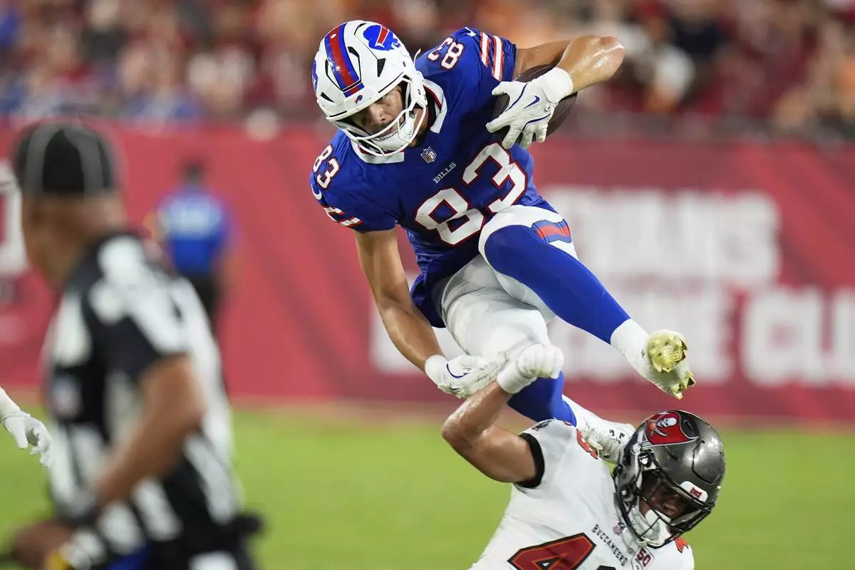 Buffalo Bills tight end Keleki Latu goes over Tampa Bay Buccaneers cornerback Roman Parodie during the second half of an NFL preseason football game, Saturday, Aug. 23, 2025, in Tampa, Fla. (AP Photo/Chris O'Meara)