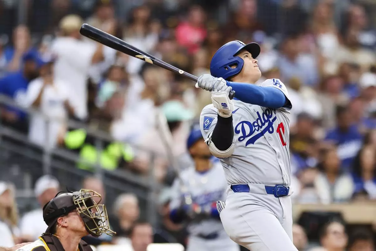 Los Angeles Dodgers' Shohei Ohtani flys out to center field against the San Diego Padres in the sixth inning of a baseball game Saturday, Aug. 23, 2025, in San Diego. (AP Photo/Derrick Tuskan)