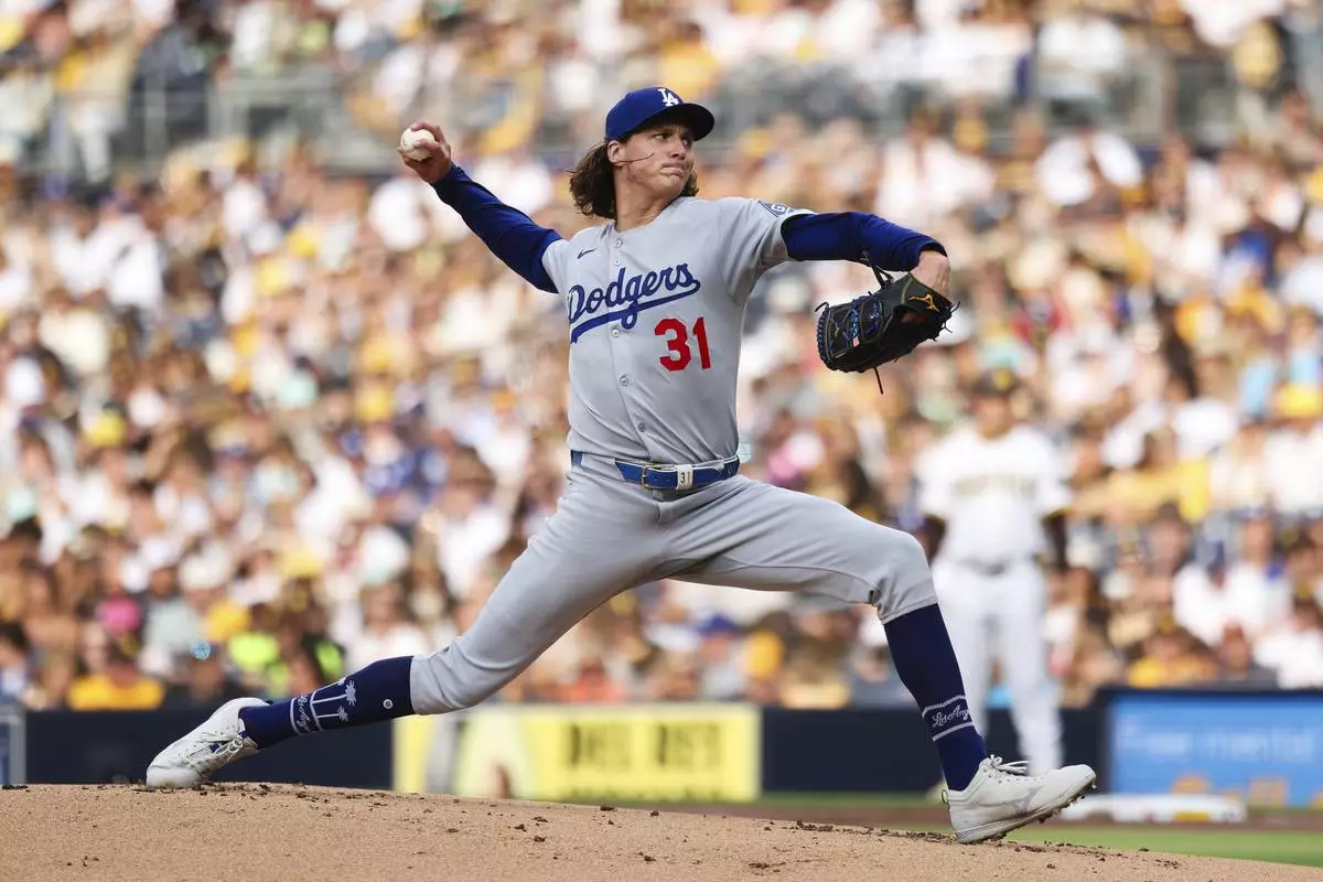 Los Angeles Dodgers starting pitcher Tyler Glasnow works against the San Diego Padres in the first inning of a baseball game Saturday, Aug. 23, 2025, in San Diego. (AP Photo/Derrick Tuskan)
