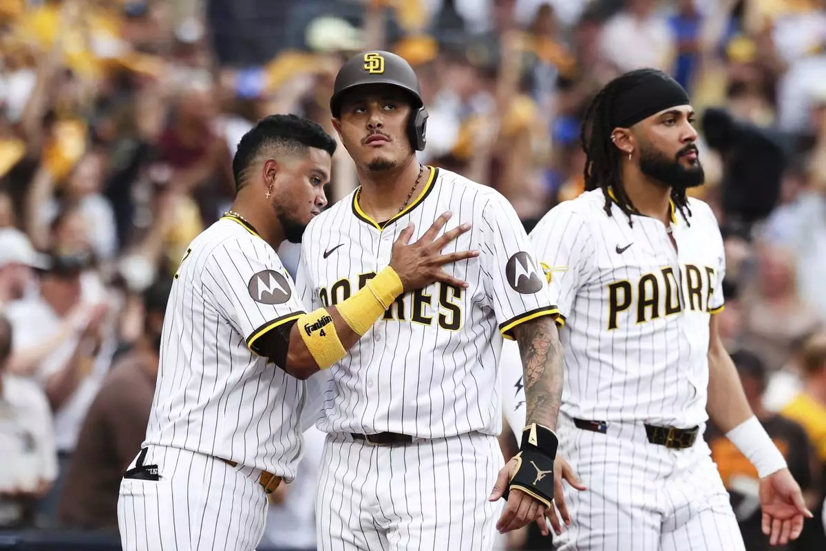 San Diego Padres' Manny Machado, center, is congratulated by Luis Arraez, left, after scoring on a single by Ramon Laureano against the Los Angeles Dodgers in the fourth inning of a baseball game Saturday, Aug. 23, 2025, in San Diego. (AP Photo/Derrick Tuskan)