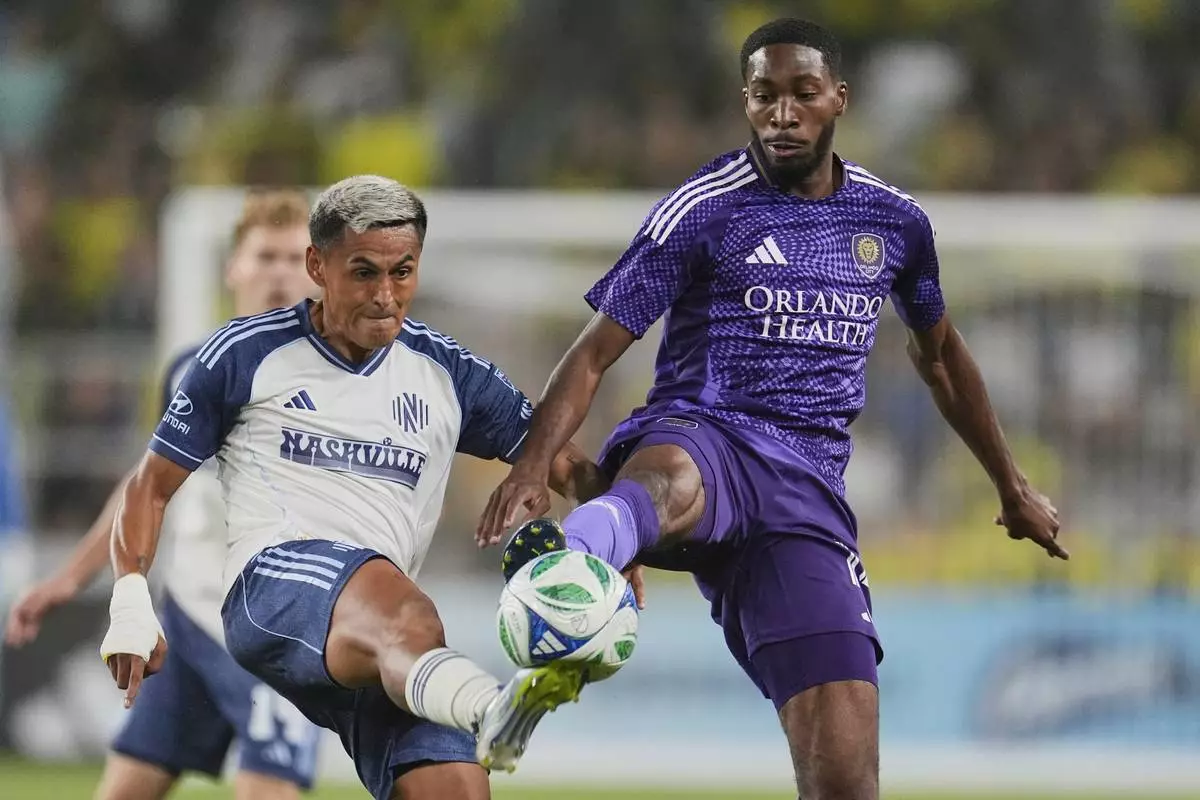 Nashville SC midfielder Gastón Brugman, left, and Orlando City forward Tyrese Spicer, right, vie for the ball during the first half of an MLS soccer match Saturday, Aug. 23, 2025, in Nashville, Tenn. (AP Photo/George Walker IV)
