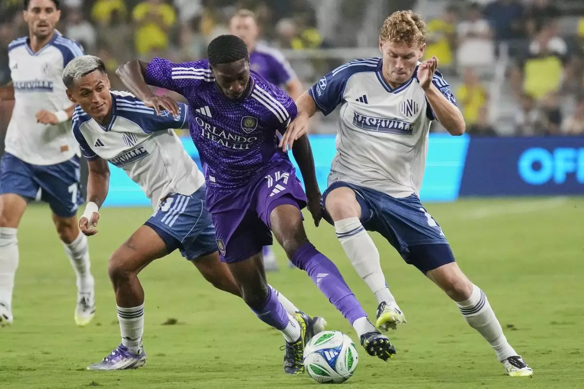 Orlando City forward Tyrese Spicer, center, moves the ball past Nashville SC midfielder Andy Najar, left, and forward Jacob Shaffelburg, right, during the first half of an MLS soccer match Saturday, Aug. 23, 2025, in Nashville, Tenn. (AP Photo/George Walker IV)