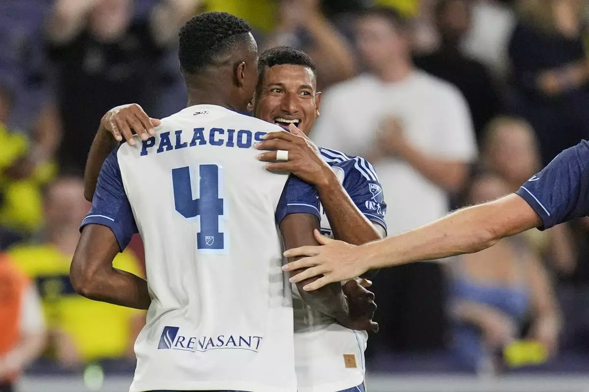 Nashville SC midfielder Bryan Acosta, right, congratulates defender Jeisson Palacios (4) after a goal during the second half of an MLS soccer match against Orlando City, Saturday, Aug. 23, 2025, in Nashville, Tenn. (AP Photo/George Walker IV)