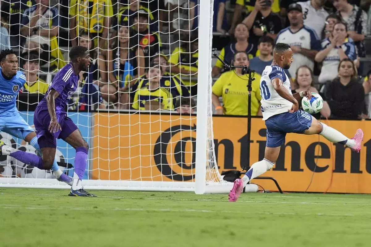 Nashville SC midfielder Hany Mukhtar, right, scores a goal against Orlando City during the first half of an MLS soccer match Saturday, Aug. 23, 2025, in Nashville, Tenn. (AP Photo/George Walker IV)