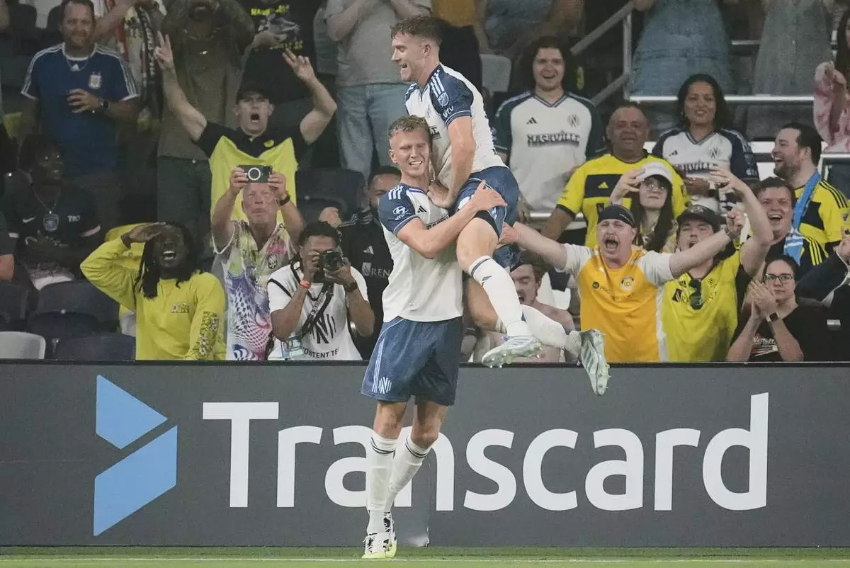Nashville SC defender Josh Bauer, right, congratulates forward Sam Surridge, left, after scoring a goal during the first half of an MLS soccer match against Orlando City, Saturday, Aug. 23, 2025, in Nashville, Tenn. (AP Photo/George Walker IV)