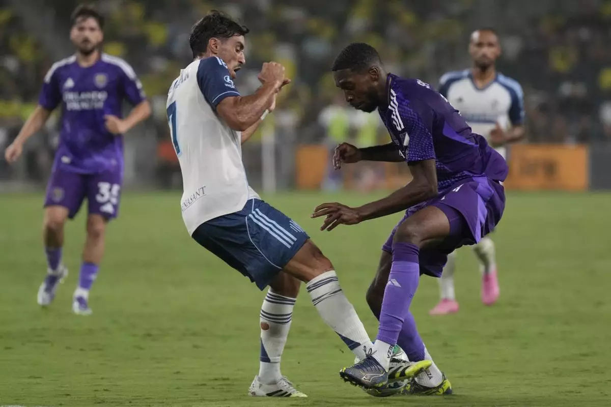 Nashville SC midfielder Andy Najar, left, kicks the ball past Orlando City forward Tyrese Spicer, right, during the first half of an MLS soccer match Saturday, Aug. 23, 2025, in Nashville, Tenn. (AP Photo/George Walker IV)
