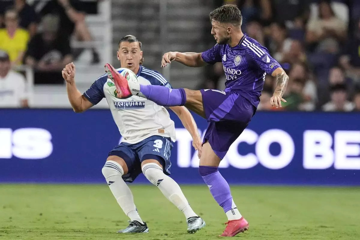 Nashville SC midfielder Patrick Yazbek (8) kicks the ball past Orlando City forward Marco Pašalić, right, during the second half of an MLS soccer match Saturday, Aug. 23, 2025, in Nashville, Tenn. (AP Photo/George Walker IV)