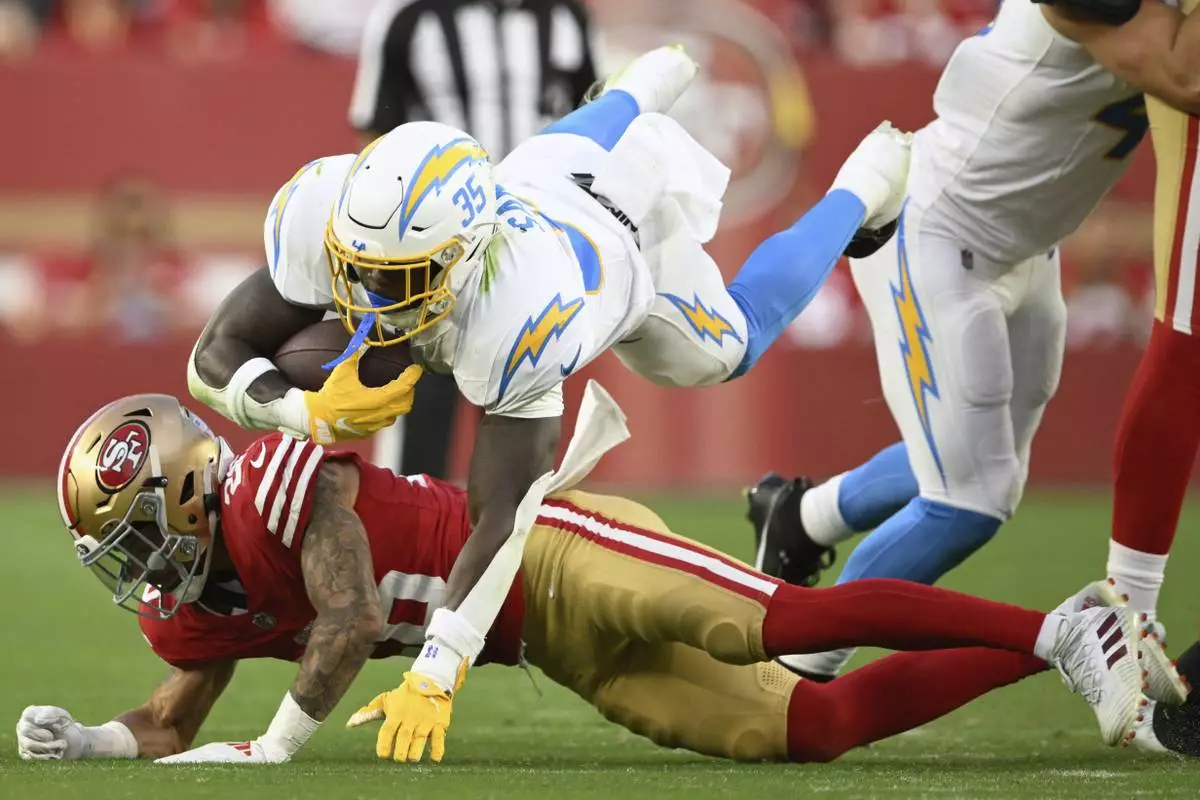 Los Angeles Chargers running back Raheim Sanders (35) jumps over San Francisco 49ers cornerback Chase Lucas during the second half of an NFL preseason football game in Santa Clara, Calif., Saturday, Aug. 23, 2025. (AP Photo/Eakin Howard)