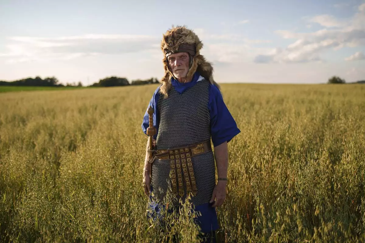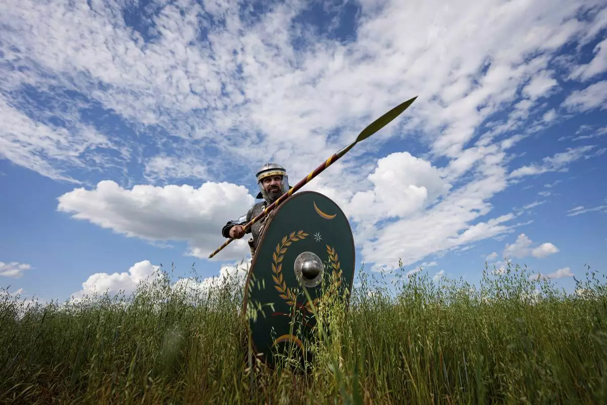 Andrei Tase poses for a portrait, wearing a Roman soldier outfit, in Poiana, Romania, Saturday, July 12, 2025, during the Getodava historical reenactment festival. (AP Photo/Vadim Ghirda)