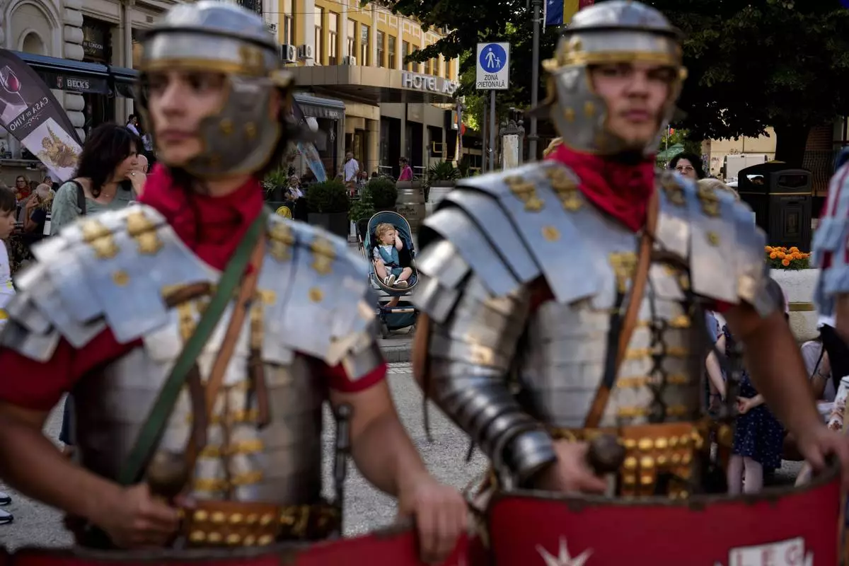 A baby sits in a stroller behind men wearing Roman soldiers outfits in Iasi, Romania, Friday, July 11, 2025 ahead of the Getodava historical reenactment festival. (AP Photo/Andreea Alexandru)
