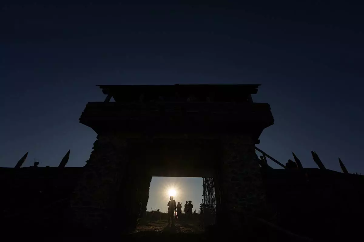 People are silhouetted by the setting sun as they walk around a replica of a Getic fortress in Poiana, Romania, Saturday, July 12, 2025, during the Getodava historical reenactment festival. (AP Photo/Andreea Alexandru)