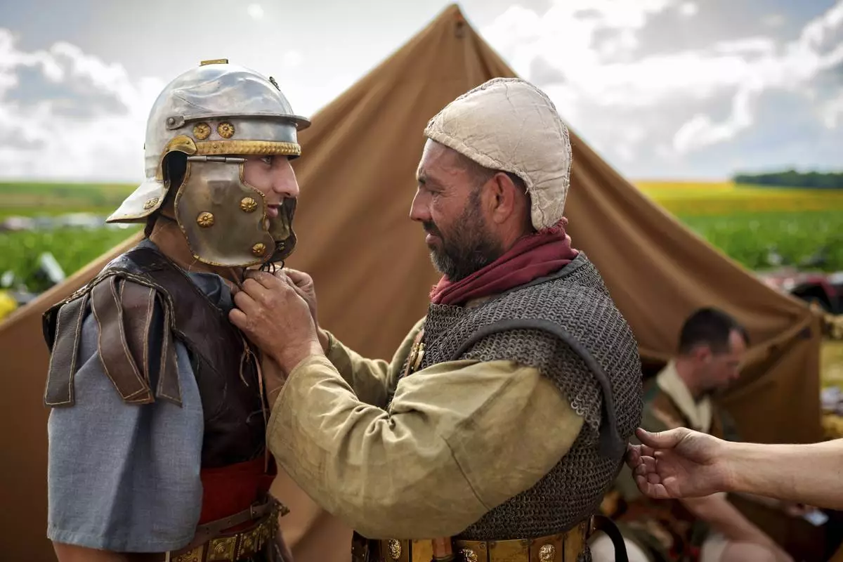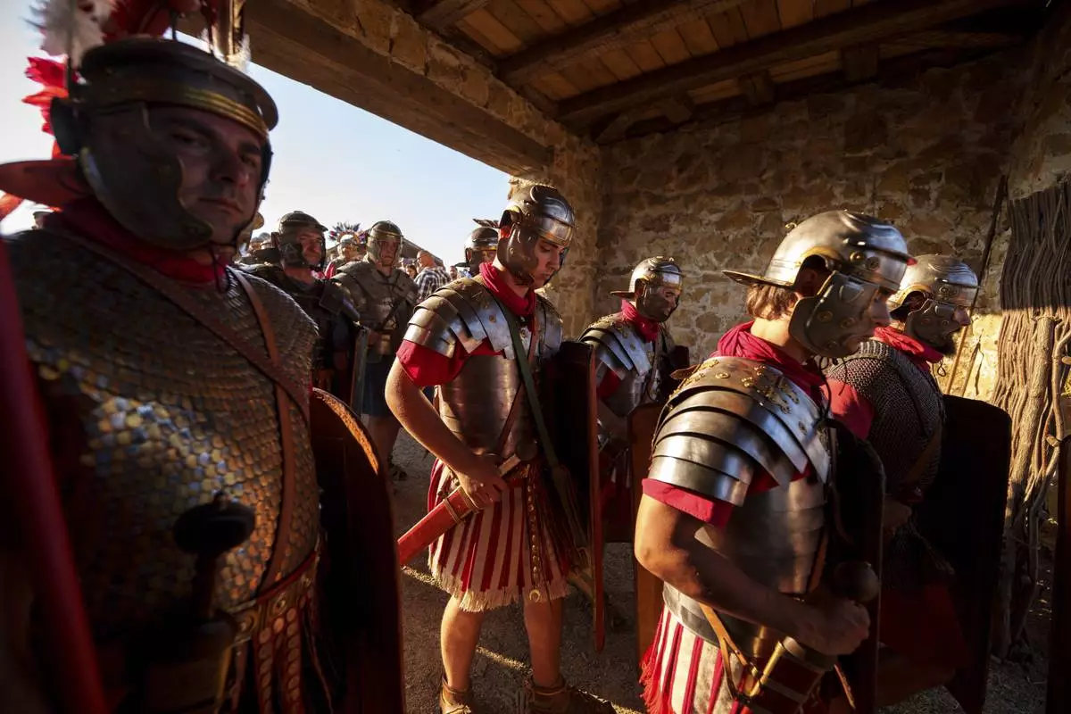 Members of historical reenactment groups wearing Roman soldier outfits, prepare to demonstrate Roman era warfare tactics in Poiana, Romania, Sunday, July 13, 2025, during the Getodava historical reenactment festival. (AP Photo/Vadim Ghirda)