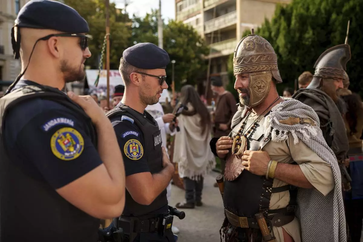 A man wearing a Dacian warrior outfits speaks to Romanian gendarmes in Iasi, Romania, Friday, July 11, 2025 ahead of the Getodava historical reenactment festival. (AP Photo/Vadim Ghirda)