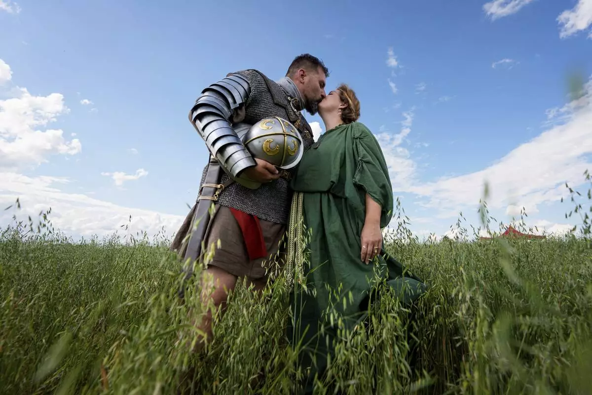 Andrej Miklanek of the Legio X Gemina Coh II, Roman era military historical group with members from the Czech Republic and Slovakia, kisses Valeria Terezia Danciakova after posing for a photograph in Poiana, Romania, Saturday, July 12, 2025, during the Getodava historical reenactment festival. (AP Photo/Andreea Alexandru)