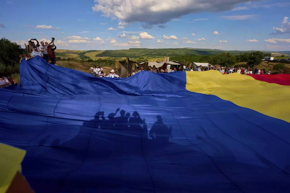 People cast shadows on a Romanian flag they unfurled in Poiana, Romania, Saturday, July 12, 2025, during the Getodava historical reenactment festival. (AP Photo/Andreea Alexandru)