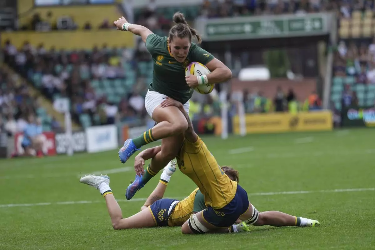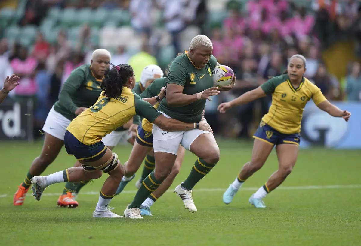 South Africa's Jacomina Cilliers is tackled during the group D match at the 2025 Women's Rugby World Cup between South Africa and Brazil in Northampton, England, Sunday, Aug. 24, 2025. (AP Photo/Dave Shopland)
