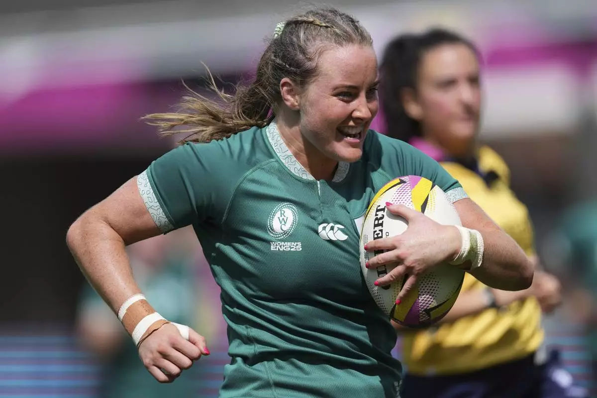 Ireland's Fiona Tuite runs on her way to score a try, during the group C match between Ireland and Japan of the 2025 Women's Rugby World Cup, in Northampton, England, Sunday, Aug. 24, 2025. (AP Photo/Dave Shopland)