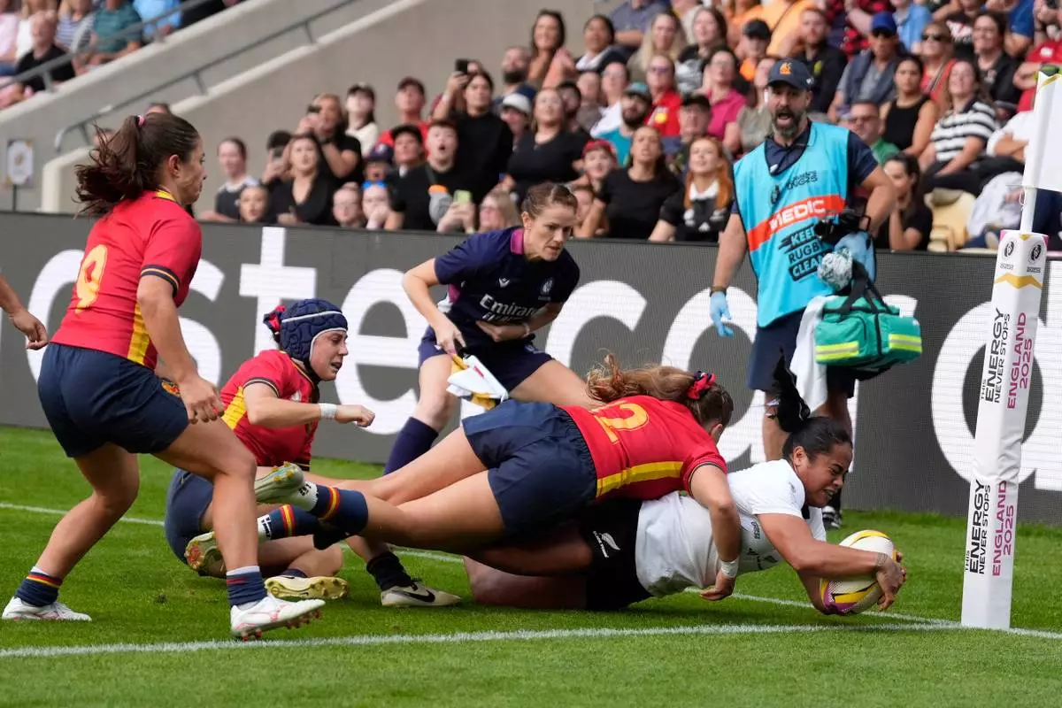 New Zealand's Ayesha Leti-I'iga scores a try during the Women's Rugby World Cup 2025 Pool C match between New Zealand and Spain at York Community Stadium in York, England, Sunday, Aug. 24, 2025. (Danny Lawson/PA via AP)