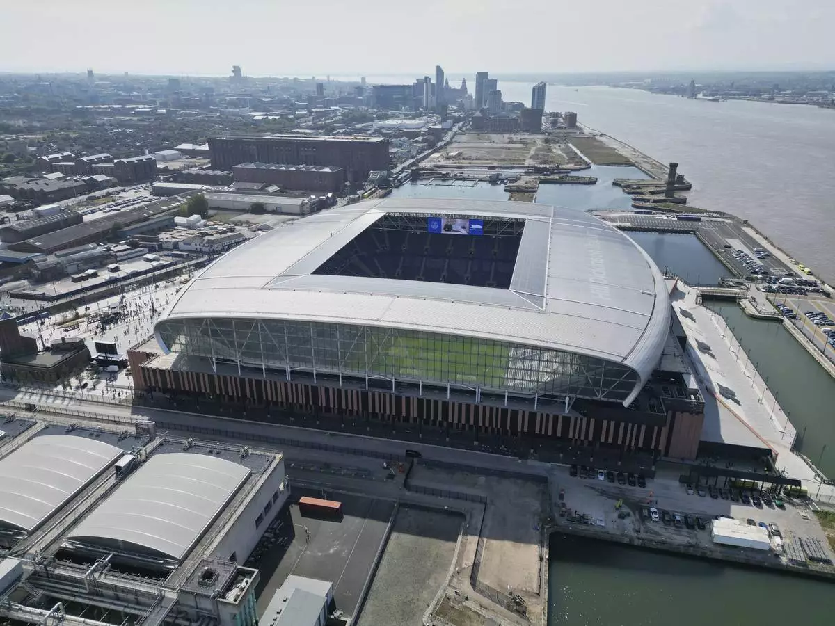 The new Everton stadium Hill Dickinson Stadium is seen before the Premier League soccer match between Everton and Brightonnd in Liverpool, England, Sunday, Aug. 24, 2025. (AP Photo/Jon Super)