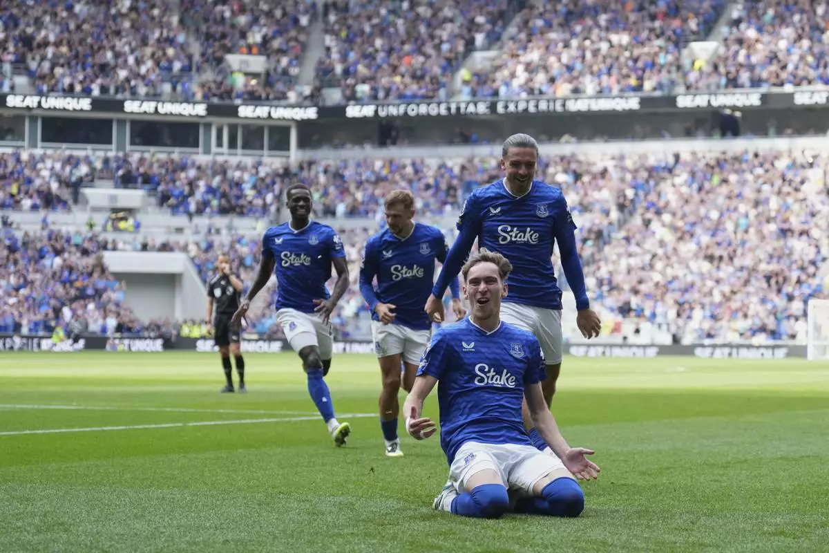 Everton's James Garner celebrates after scoring during the Premier League soccer match between Everton and Brightonnd in Liverpool, England, Sunday, Aug. 24, 2025. (AP Photo/Jon Super)