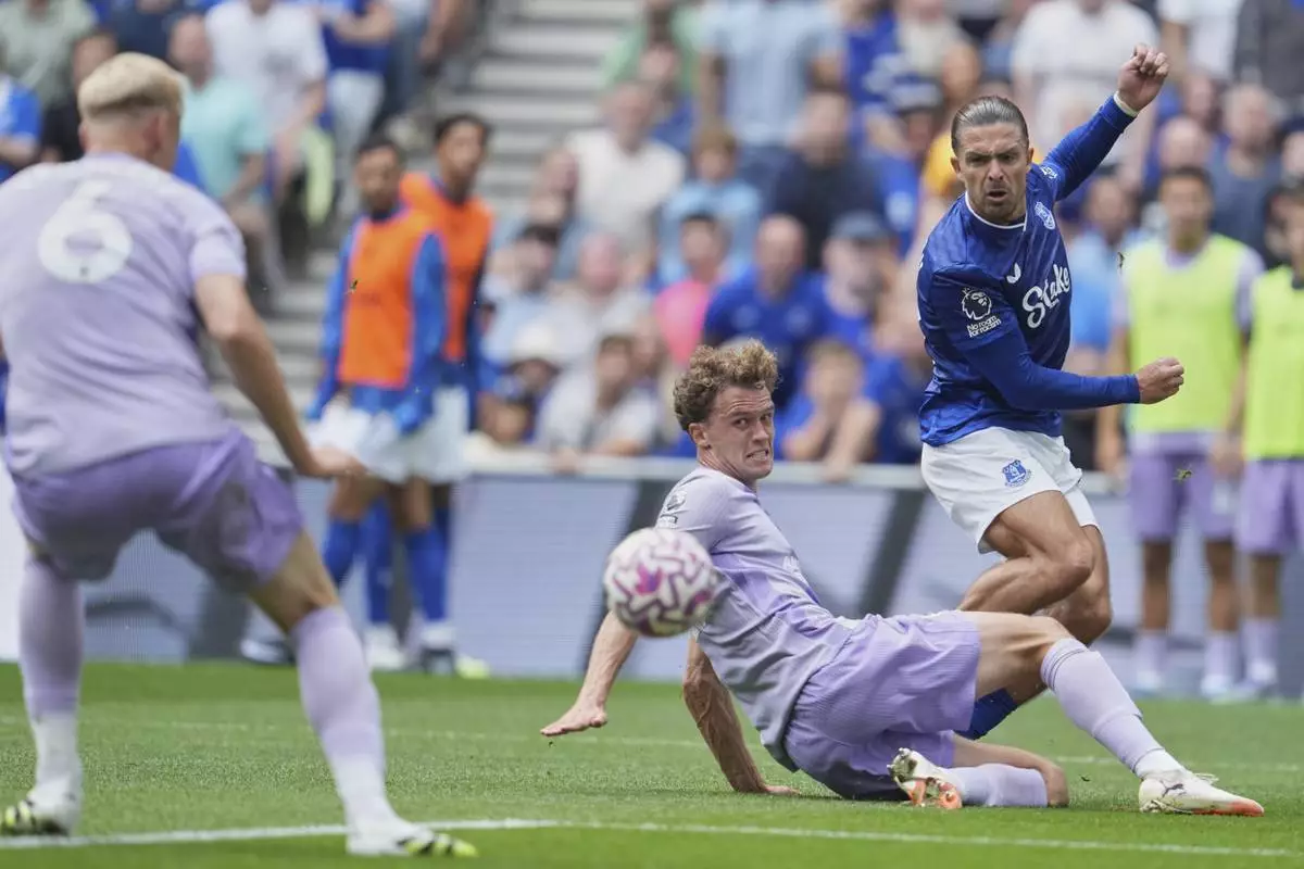 Everton's Jack Grealish sends a cross past Brighton's Mats Wieffer during the Premier League soccer match between Everton and Brightonnd in Liverpool, England, Sunday, Aug. 24, 2025. (AP Photo/Jon Super)