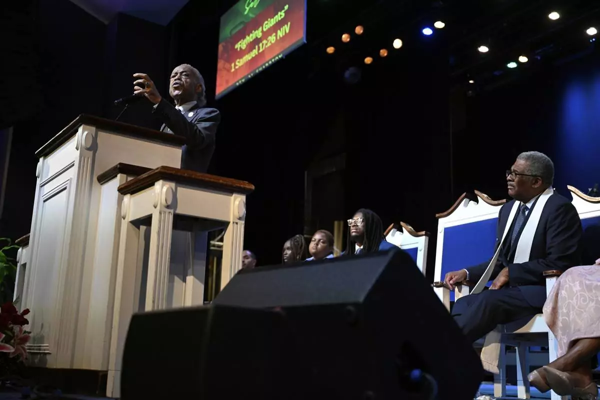 Rev. Al Sharpton delivers a sermon as Rev. Bernard L. Richardson listens at Howard University's Cramton Auditorium, Sunday, Aug. 24, 2025, in Washington, to announce a national drive in support of District of Columbia Mayor Muriel Bowser, as President Donald Trump's administration continues it's use of federal law enforcement and National Guard troops in the city. (AP Photo/John McDonnell)