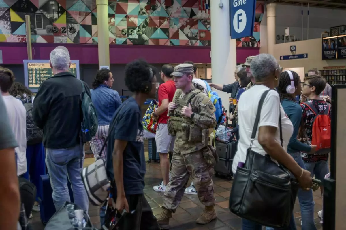Members of the South Carolina National Guard patrol the Amtrak area of Union Station in Washington, Sunday, Aug. 24, 2025. (AP Photo/Rod Lamkey, Jr.)