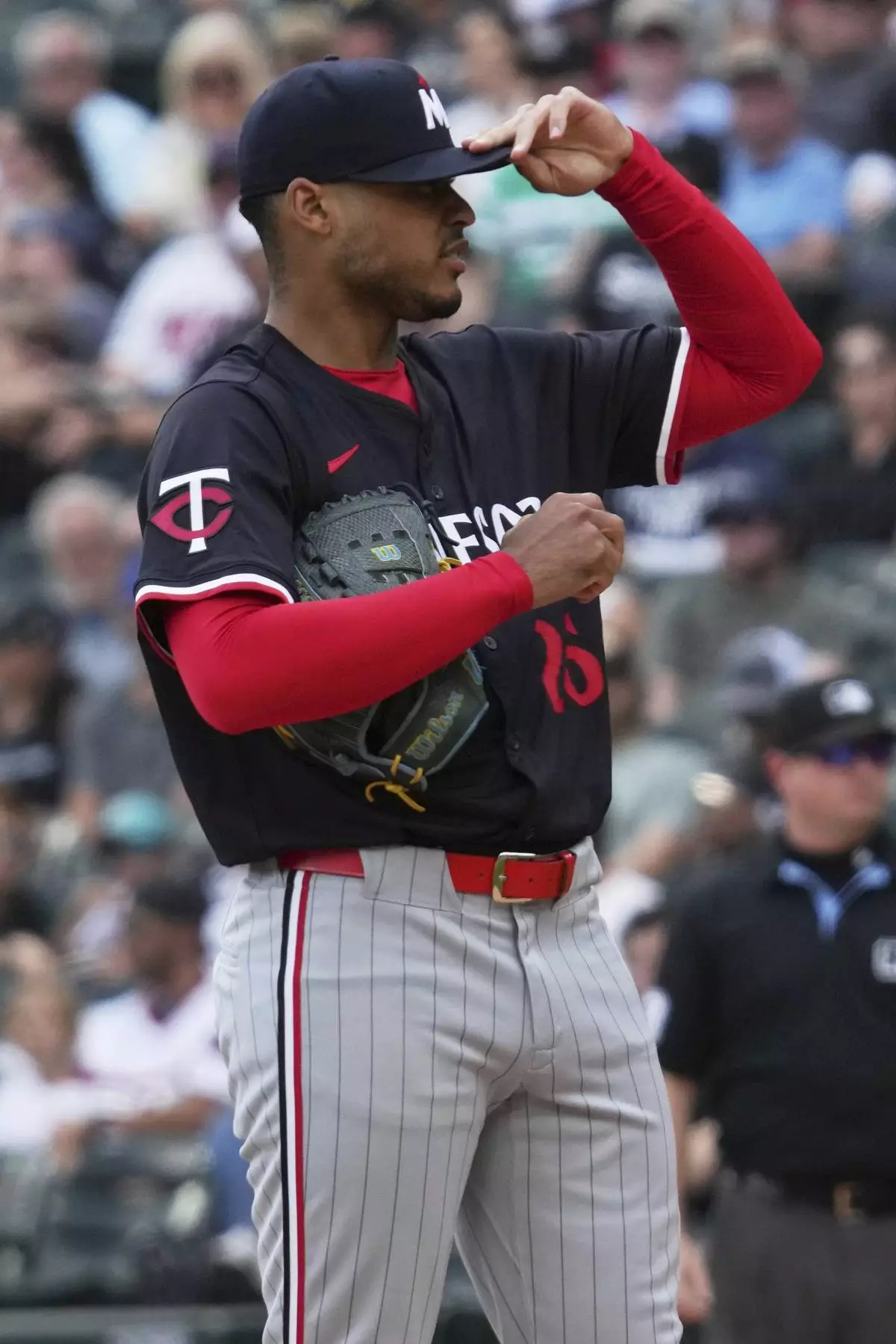 Minnesota Twins starting pitcher Taj Bradley adjusts his hat during the first inning of a baseball game against the Chicago White Sox in Chicago, Sunday, Aug. 24, 2025. (AP Photo/Nam Y. Huh)
