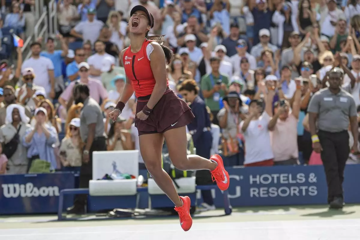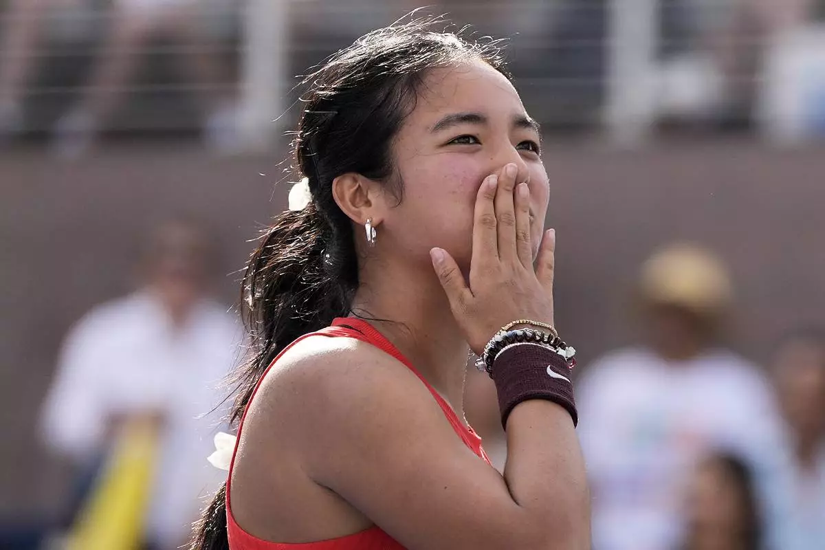 Alexandra Eala, of the Philippines, reacts after defeating Clara Tauson, of Denmark, during the first round of the US Open tennis championships, Sunday, Aug. 24, 2025, in New York. (AP Photo/Seth Wenig)