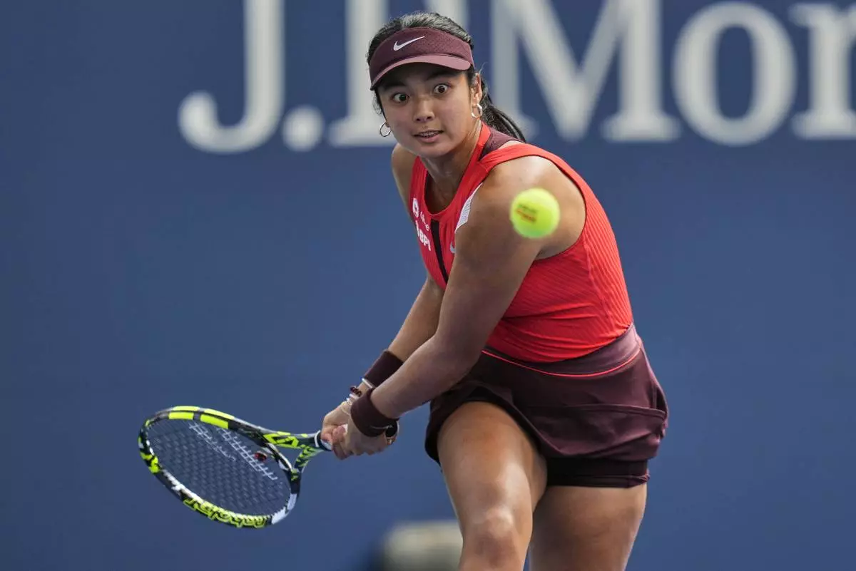 Alexandra Eala, of the Philippines, returns a shot to Clara Tauson, of Denmark, during the first round of the US Open tennis championships, Sunday, Aug. 24, 2025, in New York. (AP Photo/Seth Wenig)