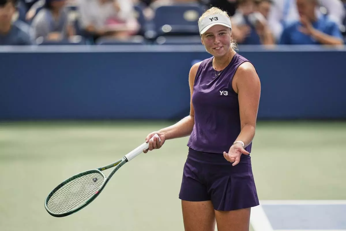 Clara Tauson, of Denmark, reacts between points against Alexandra Ella, of the Philippines, during the first round of the US Open tennis championships, Sunday, Aug. 24, 2025, in New York. (AP Photo/Seth Wenig)